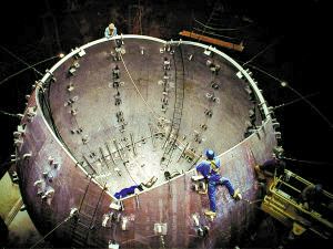 工人向目標靶室內裝填“人造太陽”的核心裝置 在加利福尼亞州利弗莫爾國家實驗室,一座神秘的建筑物仍在修建中。過去十多來年,這個龐大的建筑物一直是環(huán)保主義者關注的焦點。然而,11月2日,這里進行的一次點火實驗震動了科學界。因為作為世界上第一個能產生持續(xù)核聚變的反應堆,“人造太陽”一旦成功將改寫人類的歷史。 地球上造“小太陽” 現(xiàn)今人類可利用的最大、最具商業(yè)價值的能源無疑是核能。核電站利用核能的原理是核裂變,即在高溫高壓狀態(tài),把鈾或钚等重原子分裂成輕原子,導致其釋放大量能量的核反應方式。但是國家點火裝置利用核能的方式則反其道而行之,不是核裂變,而是核聚變。核聚變是指由質量輕的原子,主要是指氘或氚,在高溫高壓下,發(fā)生原子核互相聚合作用,生成新的質量更重的原子核,并伴隨著巨大的能量釋放的一種核反應形式。太陽發(fā)光發(fā)熱就是利用核聚變產生的能量。 與核裂變相比,核聚變不僅安全,而且相對環(huán)保。利弗莫爾國家點火裝置曾對媒體說:“太陽產生的光和熱抵達地球,不會產生任何放射性的副產品,而且能長期高效的生產。如果把太陽換成我們正在研究的核聚變反應堆,就等于在地球上建造了一個提供清潔能源的小太陽。” 釋放1.3兆焦耳能量 目前,這個“小太陽”已經初具規(guī)模,并且已經進行了令人鼓舞的試驗,獲得了寶貴的試驗數(shù)據(jù)。利弗莫爾國家點火裝置的一個科研組說,11月2日他們向核聚變反應堆中心發(fā)射192束激光束,用它們瞄準一個只有花生大小卻包含氘和氚氣體的小球體。這個小球體釋放的能量高達1.3兆焦耳,其核心最高溫度大約是600萬華氏度。 國家點火裝置主管愛德華·摩西說,盡管這次試驗沒有能夠達到太陽中心溫度2700萬華氏度,也沒有引發(fā)期待中的持續(xù)性核聚變反應,但這些試驗結果依然非常振奮人心。摩西還稱,美國科學家有決心在2012年實現(xiàn)這一目標。 意義 “人造太陽”研究惠及后代 要想實現(xiàn)核聚變燃燒,首先必須點燃由氫的同位素氘和氚構成的特殊燃料。 20世紀70年代,科學家開始利用強大的激光束進行試驗,壓縮和加熱氫的同位素,使其達到熔點,這一技術被稱作慣性約束核聚變。激光發(fā)射器的作用就是促使這種核聚變快速和持續(xù)產生,包含氘和氚氣體的目標物受到外部的刺激后,將發(fā)生爆炸形成沖擊波,進一步加快目標物核心的燃燒,這種燃燒的持續(xù)性也更長。 一旦這種核聚變成現(xiàn)實,國家點火裝置內靶室的溫度會超過1億華氏度,內部壓力將超過地球大氣壓的1千億倍。國家點火裝置主管愛德華·摩西說:“為了在實驗室里產生核聚變燃燒,我們進行了長達10年的研究。目前利用核聚變或核裂變產生能量的核電站,在過去50多年已經讓發(fā)電量大幅增加,但迄今仍未證明利用氘和氚氣體融合后持續(xù)燃燒產生能源的方法可以投入使用。”因此摩西說,“人造太陽”試驗的意義不言而喻,“一旦我們掌握了實現(xiàn)太陽內部核聚變的技術,我們的子孫后代將享受到科技發(fā)展帶來的飛躍,能源短缺的時代將一去不復返。” 結構 130噸重目標靶室是核心 從上世紀90年代后期開始,利弗莫爾國家實驗室就開始建造“人造太陽”,至今整個計劃已投入約35.5億美元。11月2日進行的綜合點火試驗是迄今以來最成功的一次試驗。未來,還有更復雜和更具挑戰(zhàn)性的試驗在國家點火裝置里上演。 國家點火裝置是一棟10層樓高的建筑物,其面積相當于三個足球場。媒體稱,這個點火裝置是世界上最大的激光科學建設項目,因而成為全球“人造太陽”試驗的中心,承載著人類利用新能源的夢想。國家點火裝置控制室有一套十分先進的電腦自動控制集成系統(tǒng),它模仿了休斯敦美國宇航局的任務控制中心,被稱為史上科學儀器設計最復雜的自動控制系統(tǒng)之一。 國家點火裝置內部設有130噸重的目標靶室,這是“人造太陽”計劃最核心的部分。靶室里的中心孔洞直徑達10米,用30厘米厚的混凝土掩埋,旁邊有192個激光器向其中發(fā)射中子,以點燃反應堆,并促使包含氘和氚氣體的玻璃物目標產生極大的高溫和高壓。 這個靶室的條件將接近或達到太陽內部核聚變反應時的條件。電腦自動控制集成系統(tǒng)保證了試驗的穩(wěn)定性,因為850臺電腦使激光器發(fā)射激光的間隔不超過50微秒。 應用 世界掀起“人造太陽”熱 “人造太陽”技術可行性高、應用前景廣闊,實際上,除了美國的“人造太陽”計劃,中國、俄羅斯等世界大國目前都在研究類似“人造太陽”的核聚變技術。 國家點火裝置“人造太陽”中的核反應堆目標物是氘和氚,氘可以利用并不復雜的技術,從海水里萃取;氚在金屬鋰中存在,鋰則是土壤里的一種常見元素。所以氘和氚在現(xiàn)實中的開采和利用,相比核裂變要使用到的鈾或钚更為簡單易行。 國家點火裝置在其網站上對氘和氚的利用前景作了形象的對比。他們舉例稱,由于海水中包含氘元素,經過一定的轉化,1加侖海水可提供相當于300加侖汽油產生的能量,50加侖海水產生的燃料所含的能量,相當于2噸煤。“它們很環(huán)保,大規(guī)模應用后,可以減少對化石燃料的使用,從而大大降低碳排放量。” 更為重要的是,氘和氚沒有鈾或钚那樣劇烈的放射性,未來使用它們做反