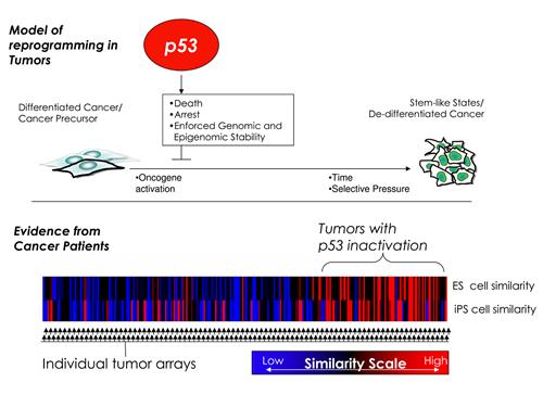 p53是人類重要的腫瘤抑制基因,正常p53的生物功能好似“基因組衛士(Guardian of the Genome)”,在G1期檢查DNA損傷點,監視基因組的完整性。當基因組遭受損傷時,p53蛋白可阻止DNA復制,以提供足夠的時間使損傷DNA修復;如果修復失敗,p53蛋白則會引發細胞凋亡。當p53基因的兩個拷貝都發生突變時,細胞的增殖會失去控制,從而導致細胞癌變。 近日來自薩克生物研究學院和普林斯頓大學高級研究所的研究人員在共同合作的一項研究中發現p53還可抑制癌細胞向更富于侵襲性的干細胞樣狀態轉化。研究人員根據p53的這個新功能將其稱之為“防止基因組重編程的衛士(Guardian against Genome Reprogramming)”。研究論文發表在本周的 PNAS 雜志上。 “眾所周知,低分化、細胞及遺傳異質性是許多侵襲性和致死性癌癥的重要特征,”薩克生物研究所基因表達實驗室的Wahl教授說道:“最近有科學家提出這些特征是由于存在干細胞樣癌細胞所致。我們的發現表明p53突變可使腫瘤細胞重新獲得干細胞樣‘編程’。” “癌細胞需要獲得干細胞的某些特征例如永生性才能生存和適應不斷變化的環境。永生能力使得細胞能夠不斷自我更新,并能生成可分化為其他細胞類型的祖細胞,”Wahl說:“所有的腫瘤都是由癌細胞組成的不同的細胞聚集物,然而目前我們尚無法了解腫瘤異質性形成的機制。” 過去科學家們將腫瘤的細胞多樣性主要歸因于其具有遺傳不穩定性。隨著腫瘤細胞群擴增,個別細胞發生隨機突變,細胞的分子特性開始出現差異,最終由成百萬的各不相同的癌細胞共同構成了腫瘤。 此外一些科學家們還認為腫瘤的異質性是由于完全定型和特化的細胞在腫瘤發生和發展的過程中發生了去分化所造成的。然而最終這一理論被丟棄,取而代之的當前流行的癌干細胞理論。癌干細胞理論認為腫瘤中存在一類重要的細胞即癌干細胞。這些癌干細胞有可能起源于正常干細胞或早期祖細胞,與其他腫瘤細胞不同它們具有自我更新的能力并可像正常干細胞一樣生成非干細胞。 “我們的研究結果表明與干細胞相似的癌細胞并不是早期腫瘤的組成部分,而是在腫瘤發生的后期隨著p53功能的喪失才出現的,“論文的共同作者、博士后研究人員Benjamin T. Spike說:“腫瘤異質性有可能是由于不斷增長的基因組不穩定性和與干細胞樣表型相關的表觀遺傳不穩定性共同作用所致。” 在新研究中研究人員證實p53不止發揮了“基因組衛士”的功能,這個腫瘤抑制因子同時還是阻斷體細胞重編程的一個重要障礙。
